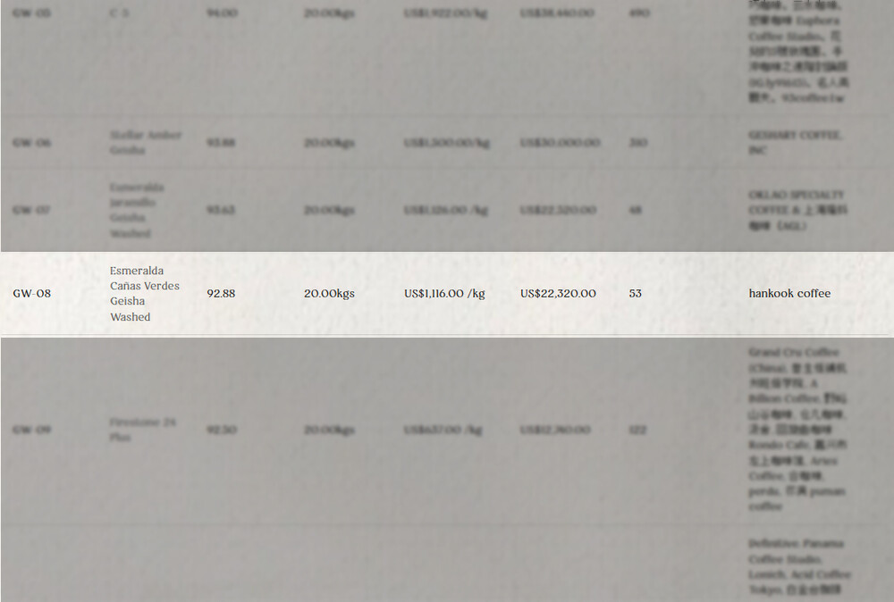 에스메랄다는 올해 역시 BOP에서 5개의 랏을 순위에 올리며 명성을 뽐냈습니다. 한국커피는 그 중에서도 클래식한 워시드 커피의 컵노트를 가지고 있던 게이샤 워시드 카테고리의 8위, 카냐스 베르데스Cañas Verdes랏을 낙찰받았습니다. 올해는 에스메랄다의 게이샤가 세상에 이름을 알린지 20주년이 되는 해인 만큼 여러모로 의미가 남다른 커피가 될 예정입니다.